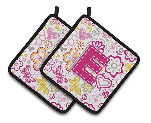 Caroline's Treasures Letter E Flowers & Butterflies pink Pair of Pot Holders CJ2005-EPTHD, 7.5HX7.5W, Multicolor