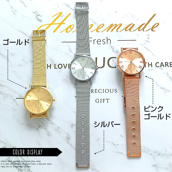 【商品詳細】 レディース用腕時計です♪アクセサリー感覚でつけられ、コーデのワンポイントに☆ 色によって印象がガラッと変わるので、色違いで揃えるのもおすすめです!【商品詳細】 カラー:ゴールド/シルバー/ピンクゴールドストラップ全長:約24cm 文字盤サイズ:直径約4cm※画像の色味はお使いのパソコンやスマートフォン等モニター環境により実際の色味とは若干異なる場合がございます。