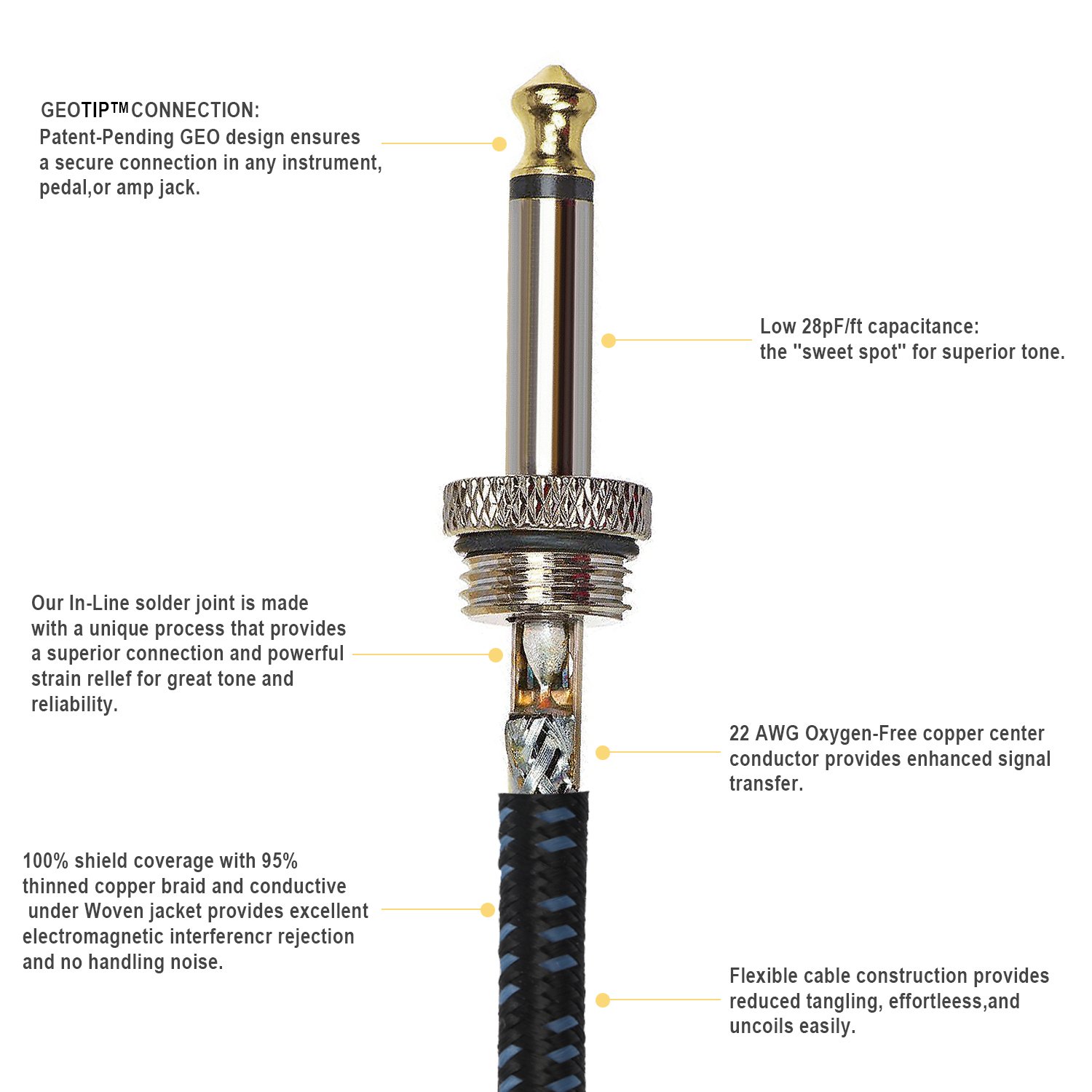 The Donner cable uses the finest OFC copper conductor to achieve a clear, natural mid range.