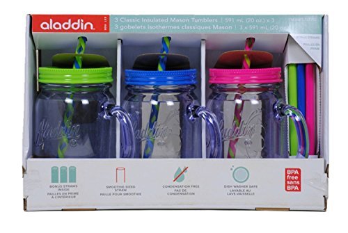 -. Title : Aladdin 3 Classic Mason Jar Tumblers w/Straws & Lids Green Blue Pink 20 Oz