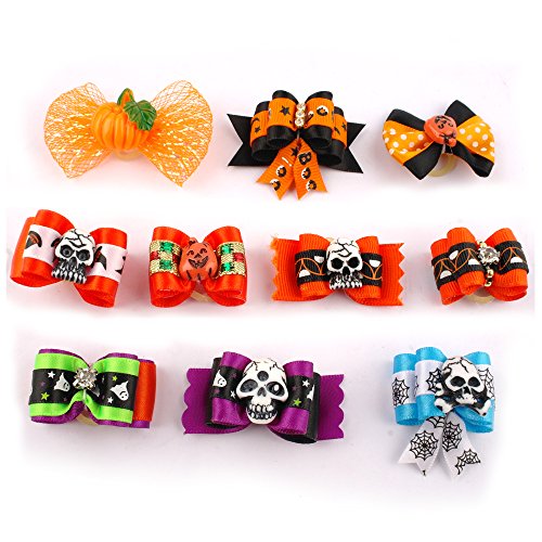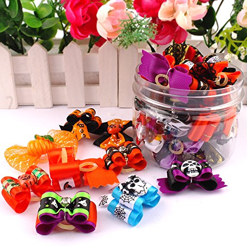 -. Title : Berry Halloween Gift Pumpkin Skull Pattent Rehinstone 20pcs Cute Dog Cat Hair Bows with Rubber Bands Nylon Pet Grooming Accessoriess Mixed Colors
