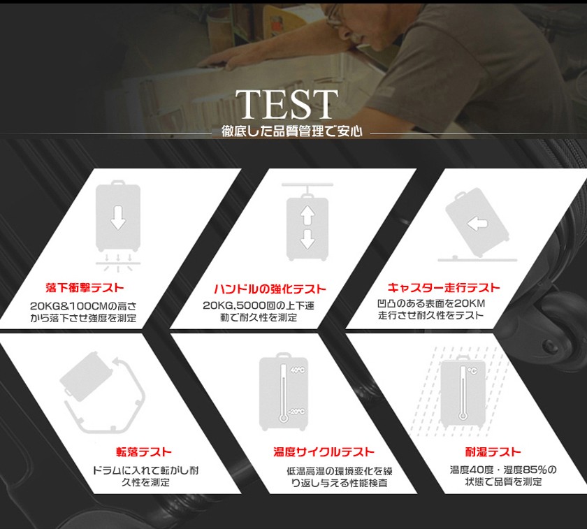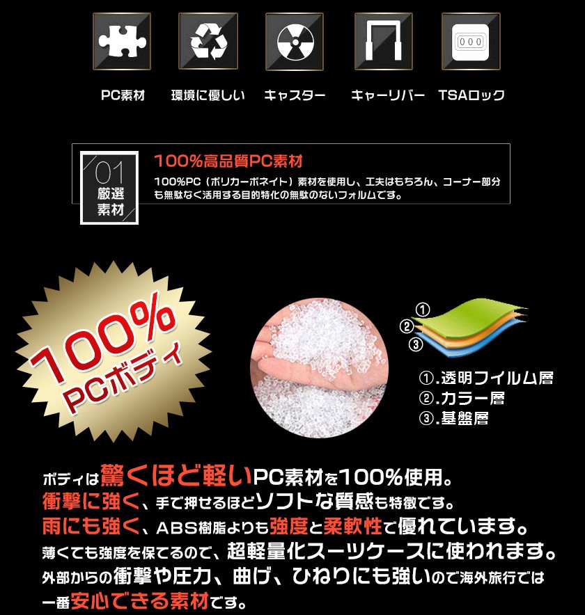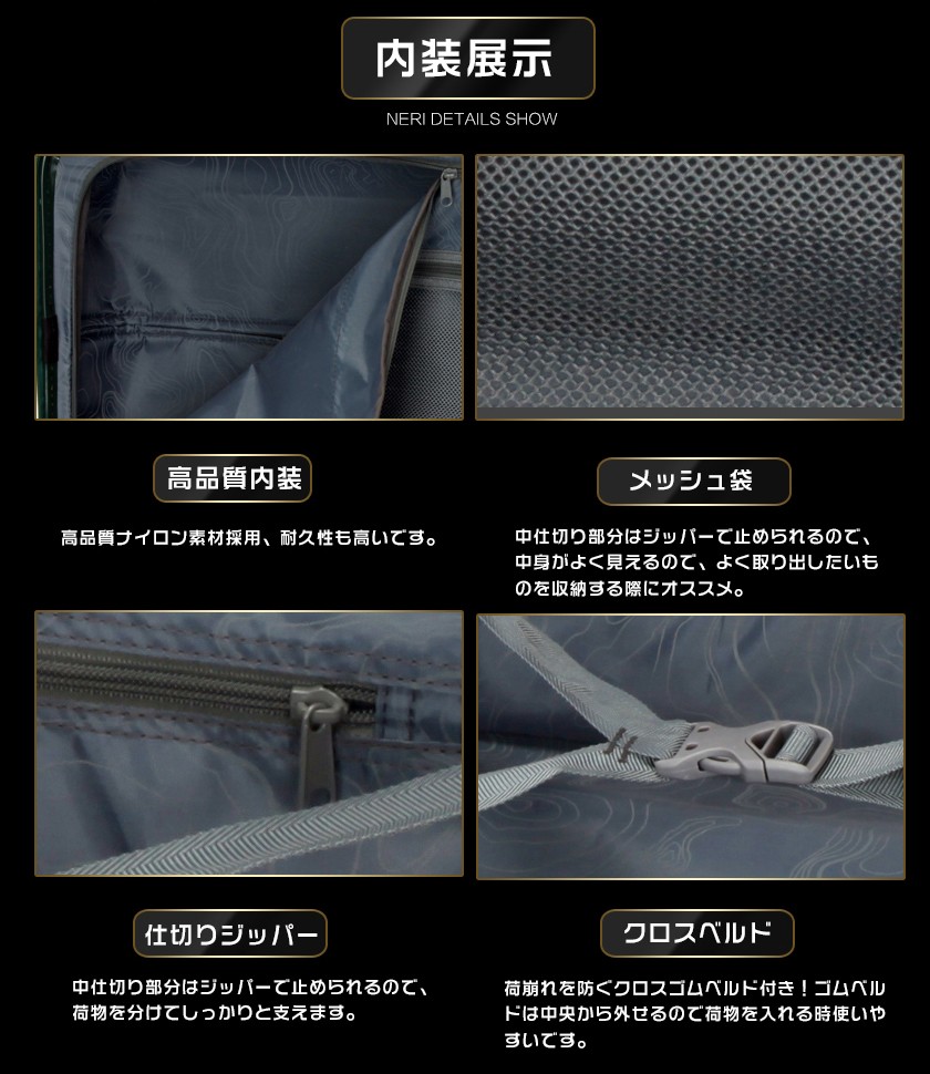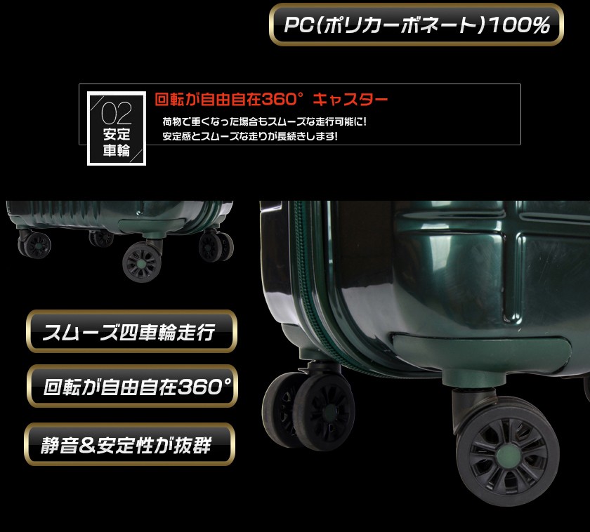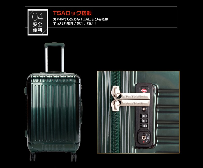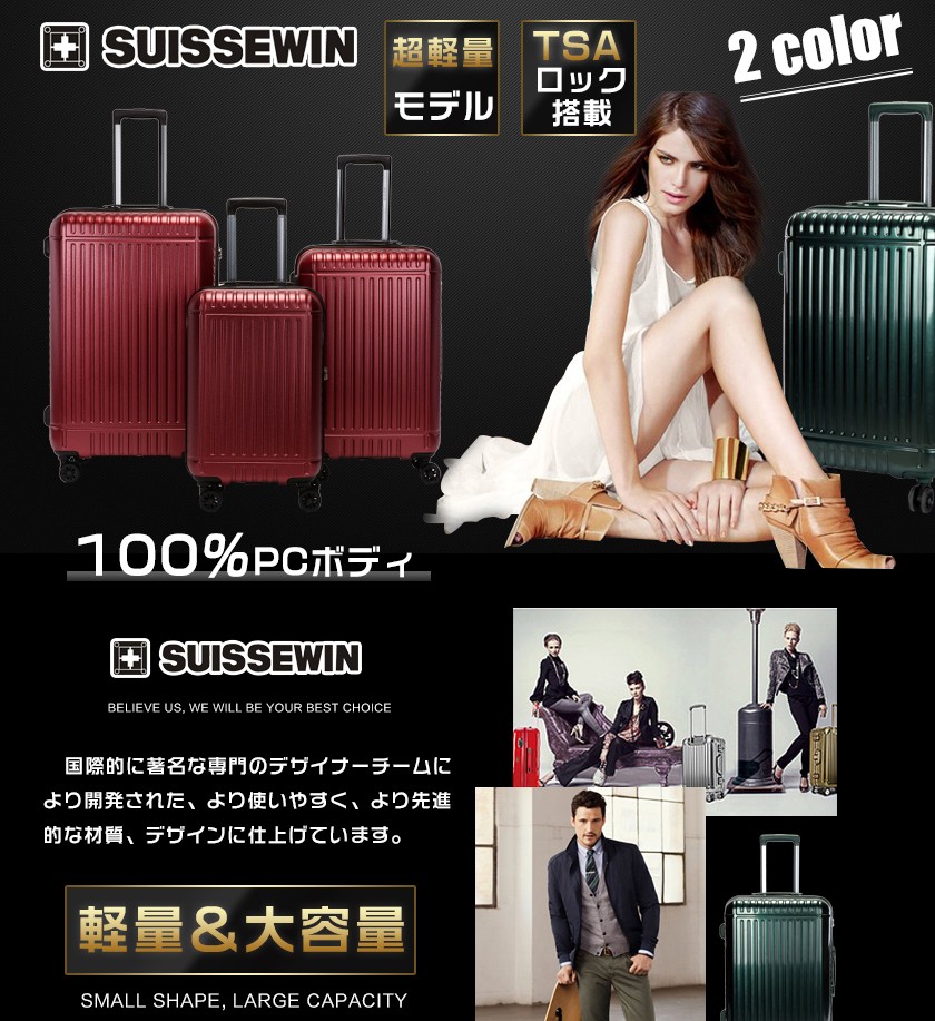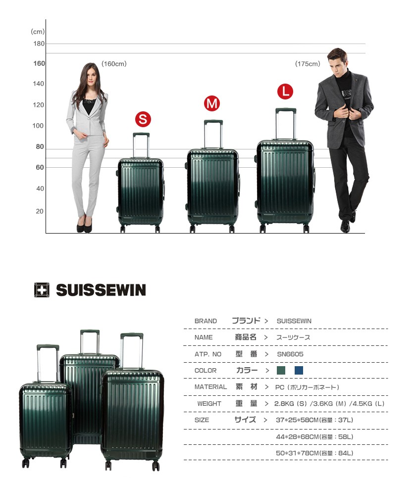 素材は軽くて耐久性に優れたABS樹脂+PC 100%(本体部分)キャスターは操作性のスムーズな360度回転 4輪独立サイレントキャスター段階調整キャリーハンドルTSAロック搭載のファスナーロック式。★商品名称:スーツケース★ブランド:SUISSEWIN★型番:SN6605★素材:表装:ABS+PC100%(本体部分)裏装:1680D ballistic nylon(バリスティック ナイロン)+Polyester(ポリエステル)★Sサイズ外寸:幅約37cm*奥行約25cm*高さ約58cm★Sサイズ重さ:約2.8KG★Sサイズ容量:37L★Mサイズ外寸:幅約44cm*奥行約28cm*高さ約68cm★Mサイズ重さ:約3.6KG★Mサイズ容量:58L★Lサイズ外寸:幅約50cm*奥行約31cm*高さ約78cm★Lサイズ重さ:約4.5KG★Lサイズ容量:84L★TSAロック:搭載カラー:グリーン、レッド※注意事項 S sizeのスーツケースは横側取っ手と底足が付いておりません。