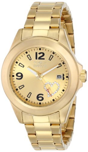 -. Binding : Watch -. Brand : Invicta -. Department : womens -. EAN : 0886678213856 -. Feature : Japanese quartz movement / Flame fusion crystal; 18K gold ion-plated stainless steel case and bracelet / Date window at 3:00 / Gold with White Crystal Heart Design Dial with Gold Tone, Red and White Hands, Black and White Hour Markers and Arabic Numerals / Water resistant to 330 feet (100 M): suitable for snorkeling, as well as swimming, but not diving -. IsAdultProduct : 0 -. Label : Invicta -. Manufacturer : Invicta -. Model : 16327 -. MPN : 16327 -. PackageQuantity : 1 -. PartNumber : 16327 -. ProductGroup : Watch -. ProductTypeName : WATCH -. Publisher : Invicta -. ReleaseDate : 2014-04-16 -. Studio : Invicta -. Title : Invicta Women's 16327 PRO DIVER Analog Display Japanese Quartz Gold Watch -. UPC : 886678213856