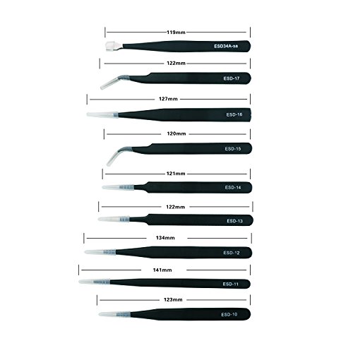 INCLUDING 9PCS PRECISION TWEEZERS - Size: ESD-10: Anti-static (123mm); ESD-11: Supper fine tip and straight (141 mm); ESD-12: Fine tip straight (134mm); ESD-13: Fine and Round (122mm); ESD-14: Fine tip straight (121mm); ESD-15: Fine tip curved (120mm); ESD-16: Fine tip straight (125mm); ESD-17: Fine tip curved (122mm); ESD-34A: Sqr head heavy-weight pointed tip (119mm).