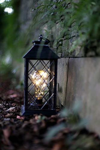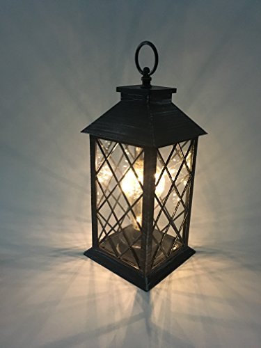- BEAUTIFUL GARDEN LANTERN - Beautiful black plastic lantern with glass panels already assembled. Operated by 3*AAA batteries (included). 5-Hour timer. Weatherproof lantern makes this the perfect accent outside on a patio, deck, in a garden, line a pathway, up and down a stairway, hanging from a tree, on a tabletop, in a bookcase, on top of kitchen cabinets or on a front porch entry way.