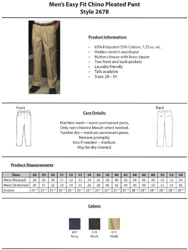Binding : Apparel Product Description Easy fit pleated front chino pant is a blended twill with a soft hand. The hidden stretch waistband give you additional comfort. Perfect for the transit, delivery service or the front office, this pant is loaded with performance features including soil release and performanceing. 65% Polyester/35% Cotton; 7.5/8.0 oz. wt, Casual chino blend easy fit pant, Pleated front, button closure and brass zipper, Two inch hidden stretch adjustable waistband, Two front and back pockets, Tall sizes available, performanceing fabric, Soil and wrinkle resistant, Laundry friendly, Men's size: 28-54 even sizes only. 0