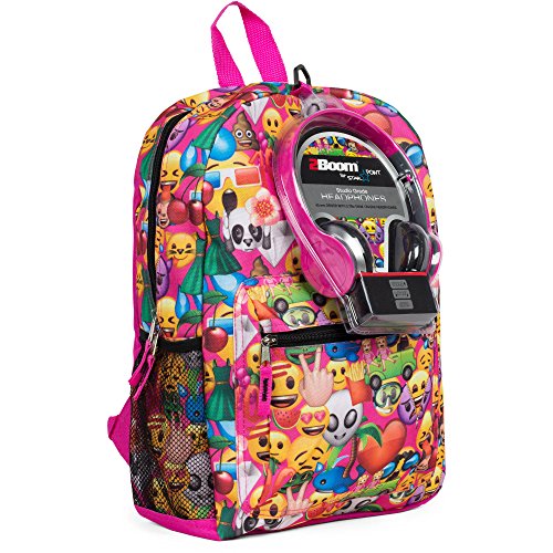 Popular emoji characters decorate this backpack and stereo headphones set. Store and carry school books, folders and accessories. The on ear headphones adjust for travel, camp or sleepover. Bright pink and rainbow colors. Graphic print from the Emoji toys and games. Durable canvas material. Ages 3 years and up.