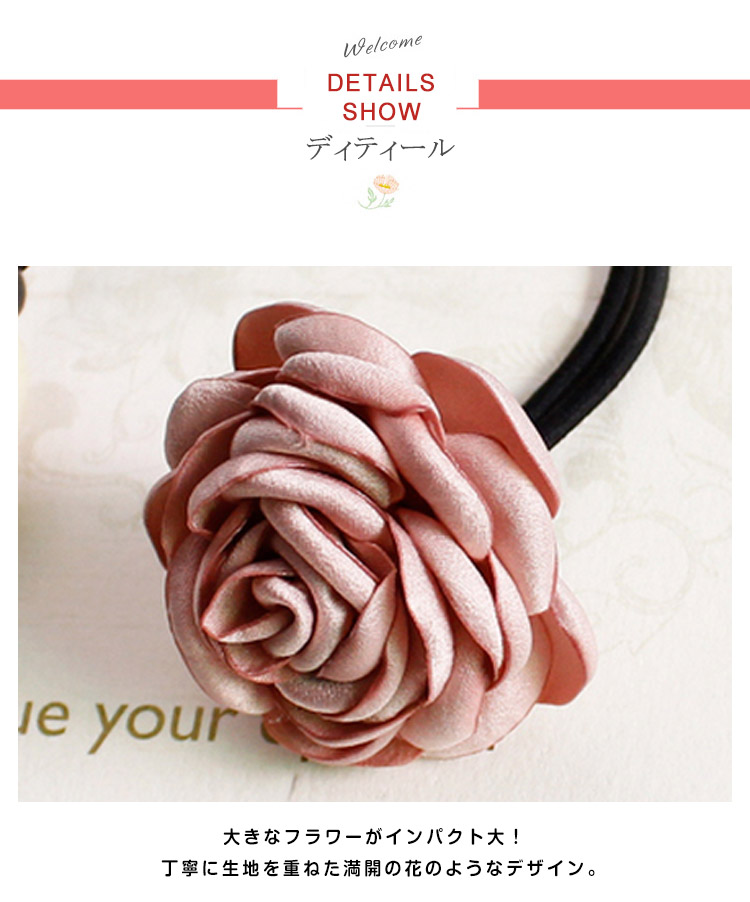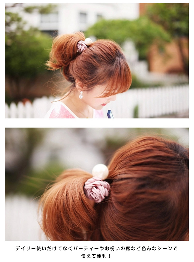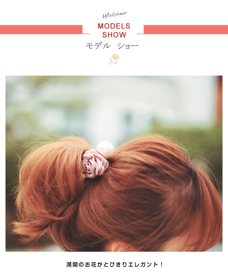 | とっても上品で女性らしい、ビックパールとフラワーモチーフのヘアゴム!満開のお花がとびきりエレガント!デイリー使いだけでなくパーティーやお祝いの席など色んなシーンで使えて便利! | |