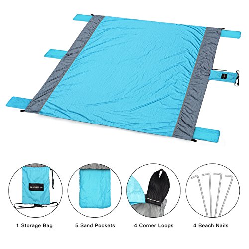 Our beach mat has four sand pockets, which you can fill with sand to help anchor the blanket on windy days. It also has a valuable pocket and a carried bag, where you can store your phone, keys, wallet or other personal items. We have extra 4 stakes to secure the blanket firmly to avoid taking away.