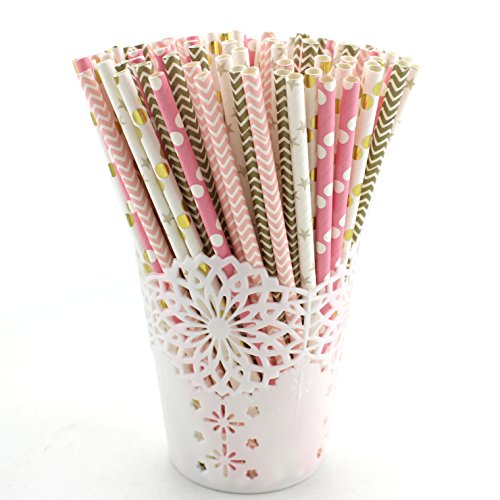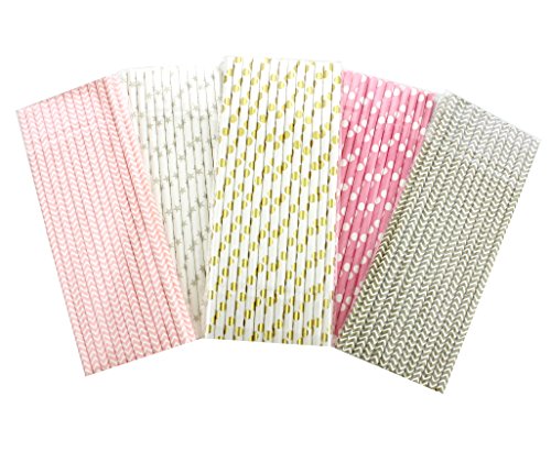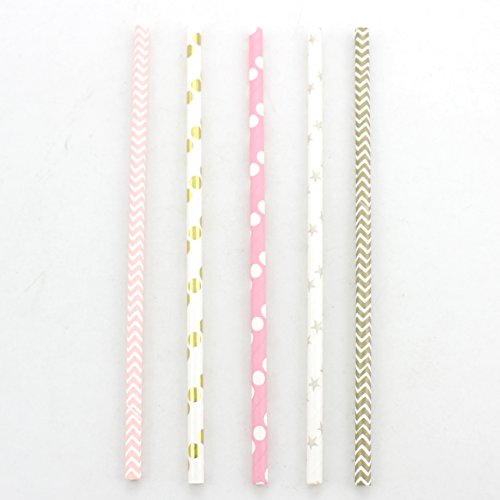 - Straw design colors included: 25 x gold wave, 25 x pink wave, 25 x white dot, 25 x pink dot and 25 x gold star paper straws