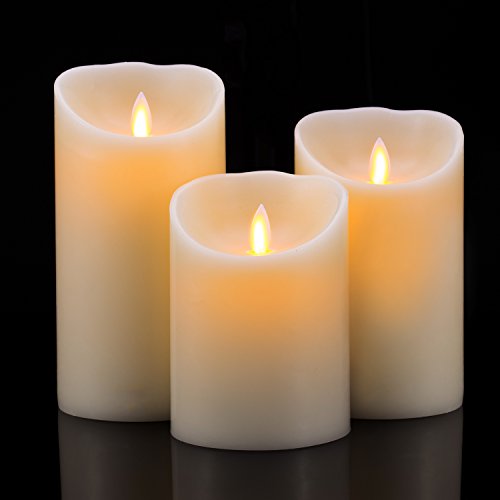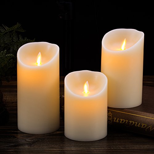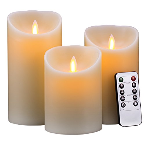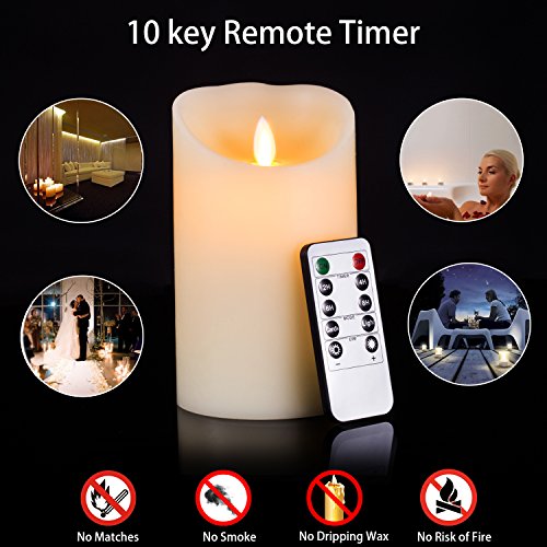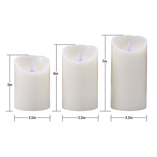 A COMPLETE SET OF FLAMELESS CANDLES: This value pack comes with 3 pieces beautiful flameless pillar candles(Diameter 3.5"*Height 5”6”7” ), 1 remote control with 10 different keys, Timer feature allows you to set 2H | 4H | 6H | 8H, timed to automatically turn on and off. A super easy to follow operating manual. All the candles coming in an elegant ivory white color that matches any house. (Batteries are not included in this package.)