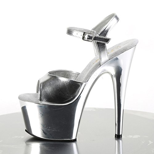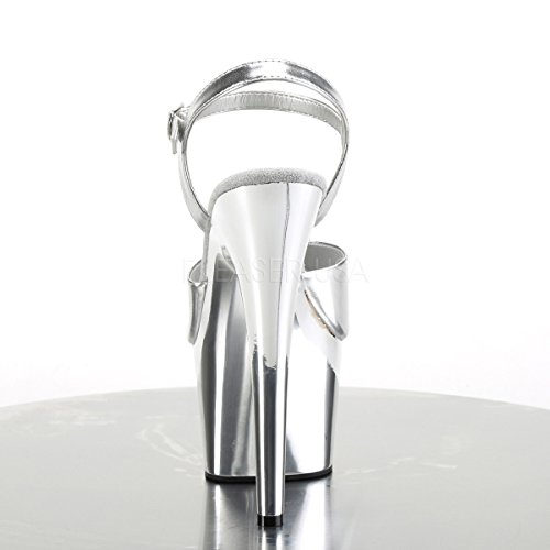 Product DescriptionADORE-709/SPU/SCH features 7" (178mm) Heel, 2 3/4" (70mm) Platform Ankle Strap Sandal w/ Chrome Plated Platform Bottom0