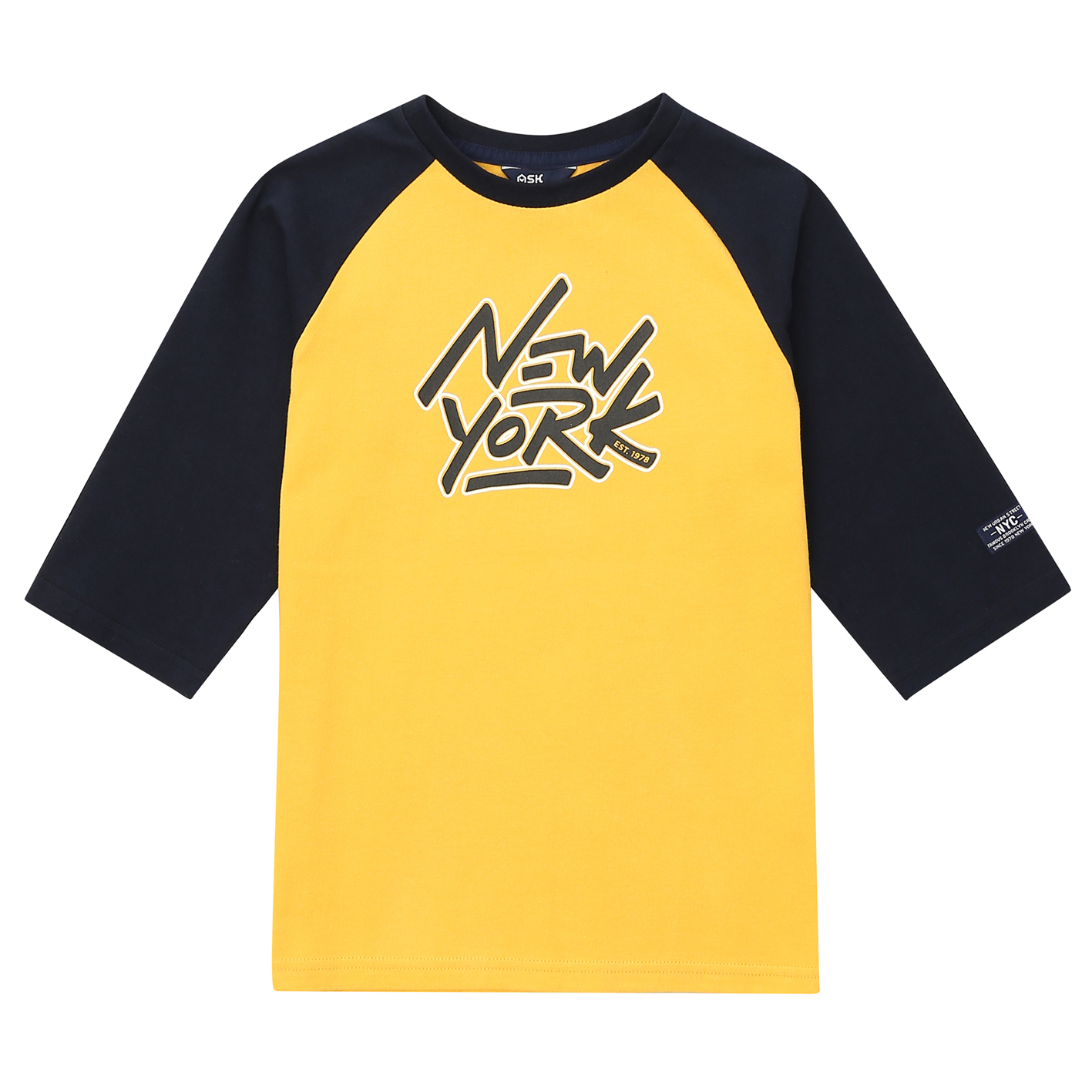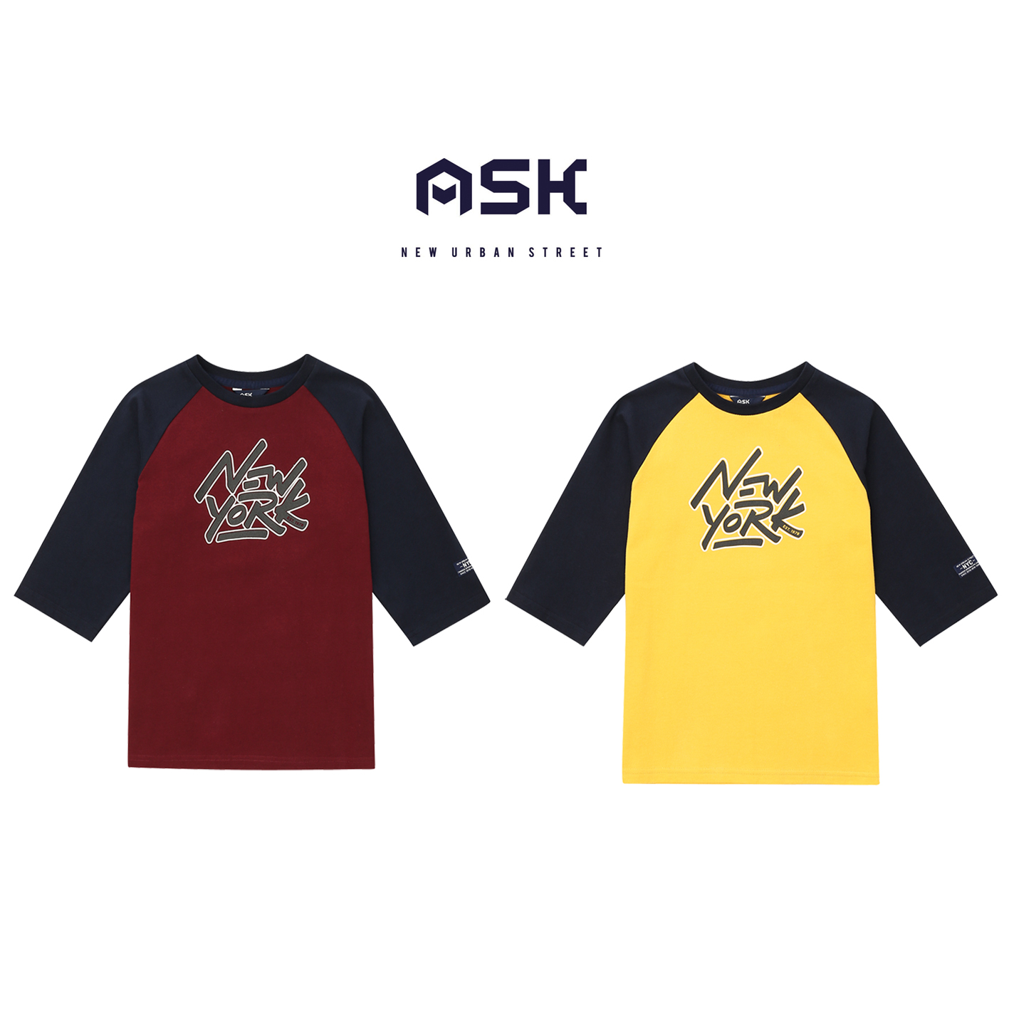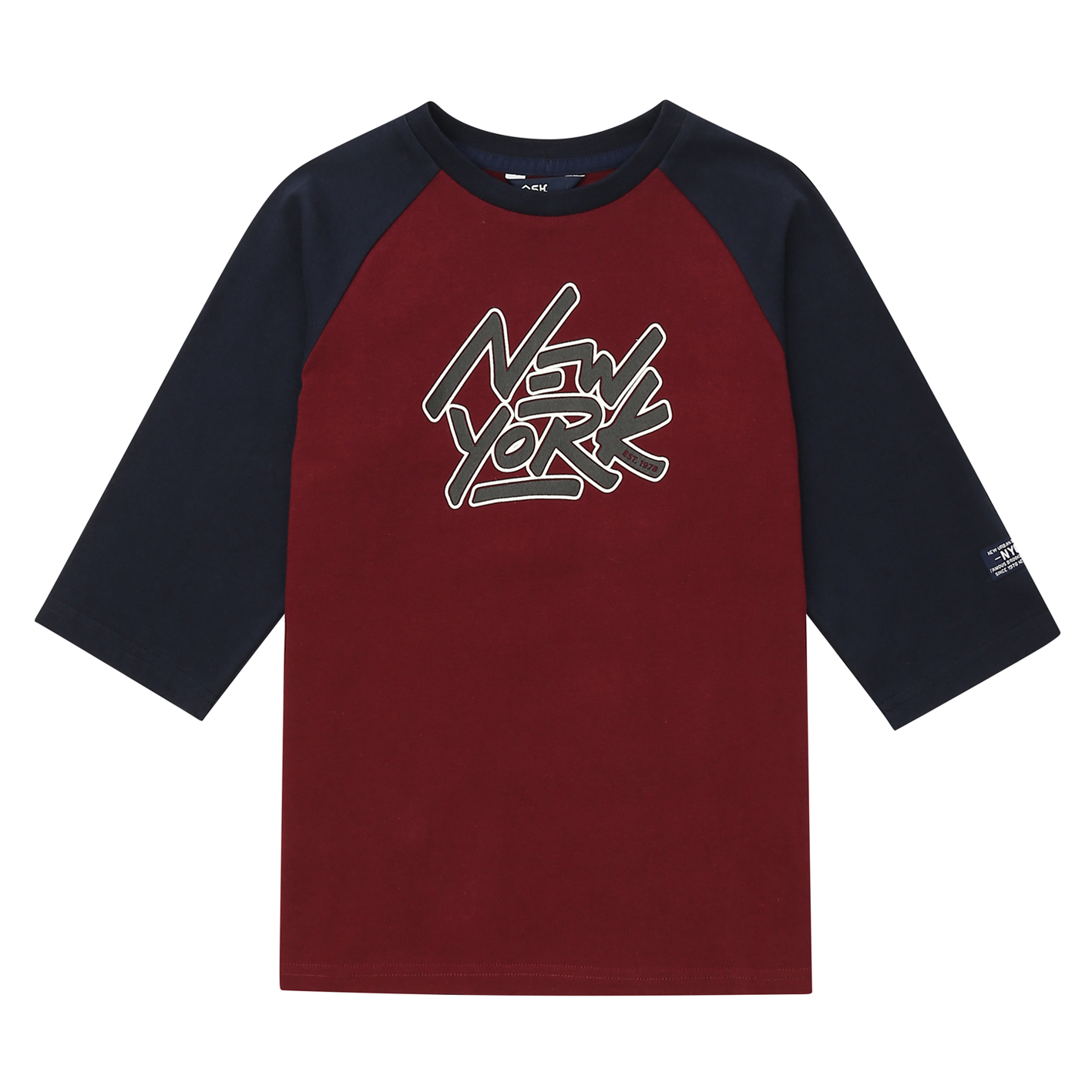 소매 7부 기장의 기본 라글란 티셔츠. 가슴 레터링으로 포인트를 준 아이템. 전략으로 판매하기 용이한 상품임.