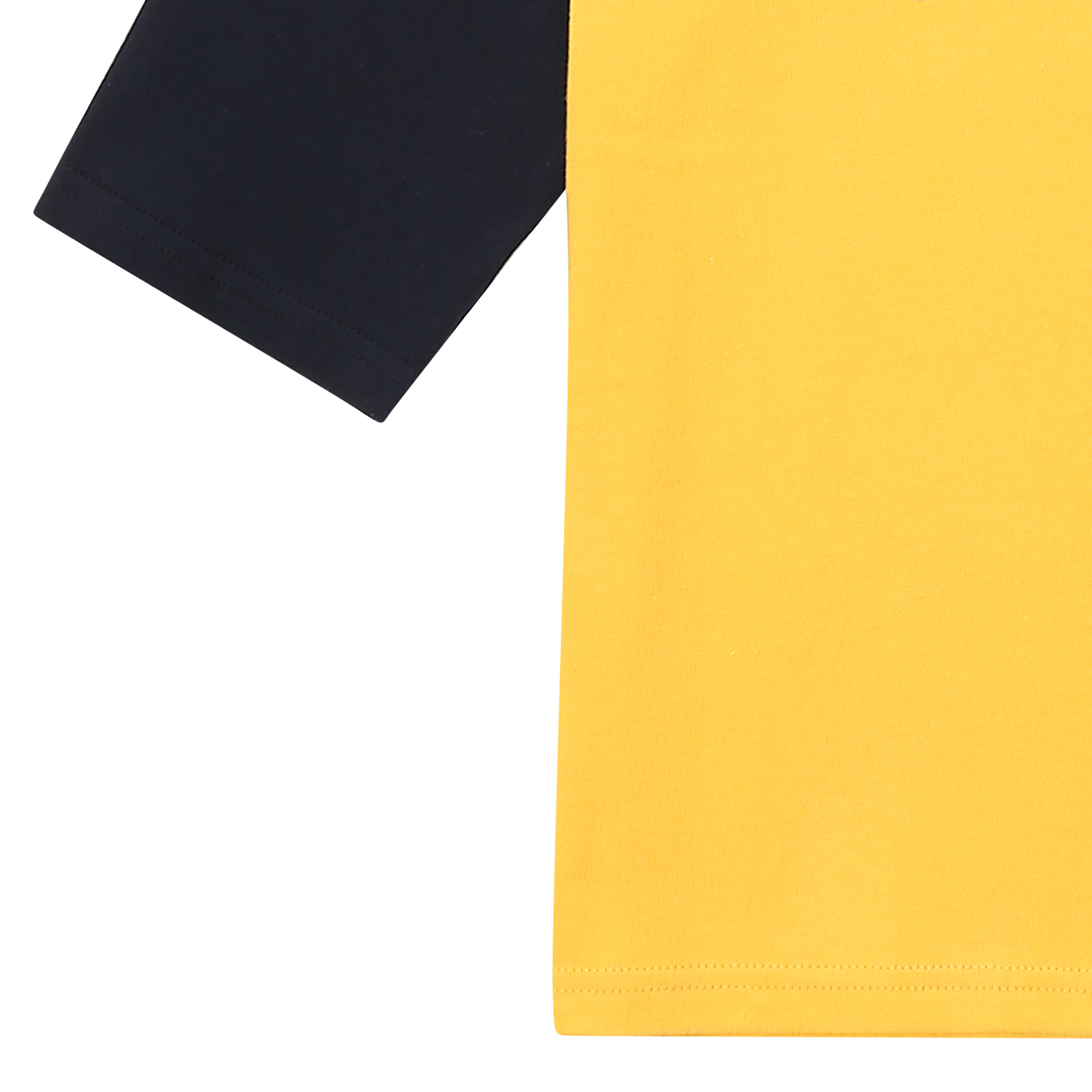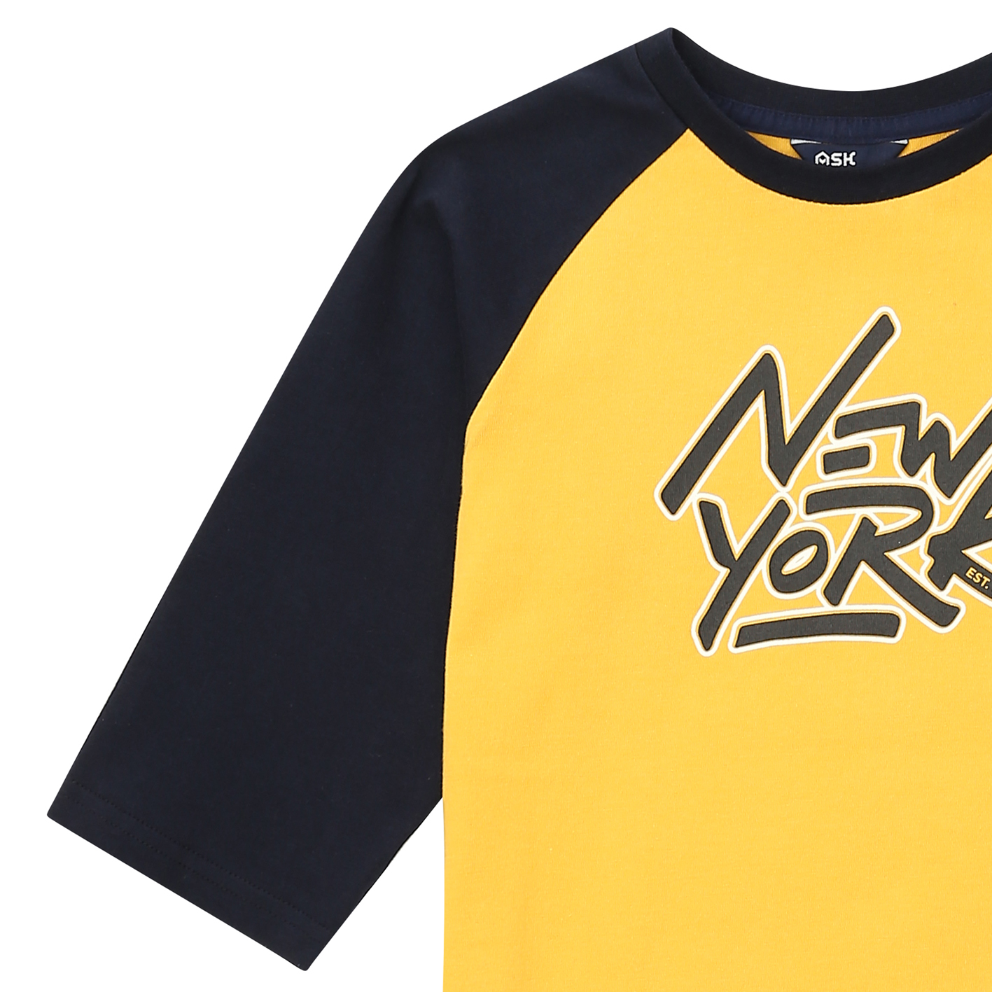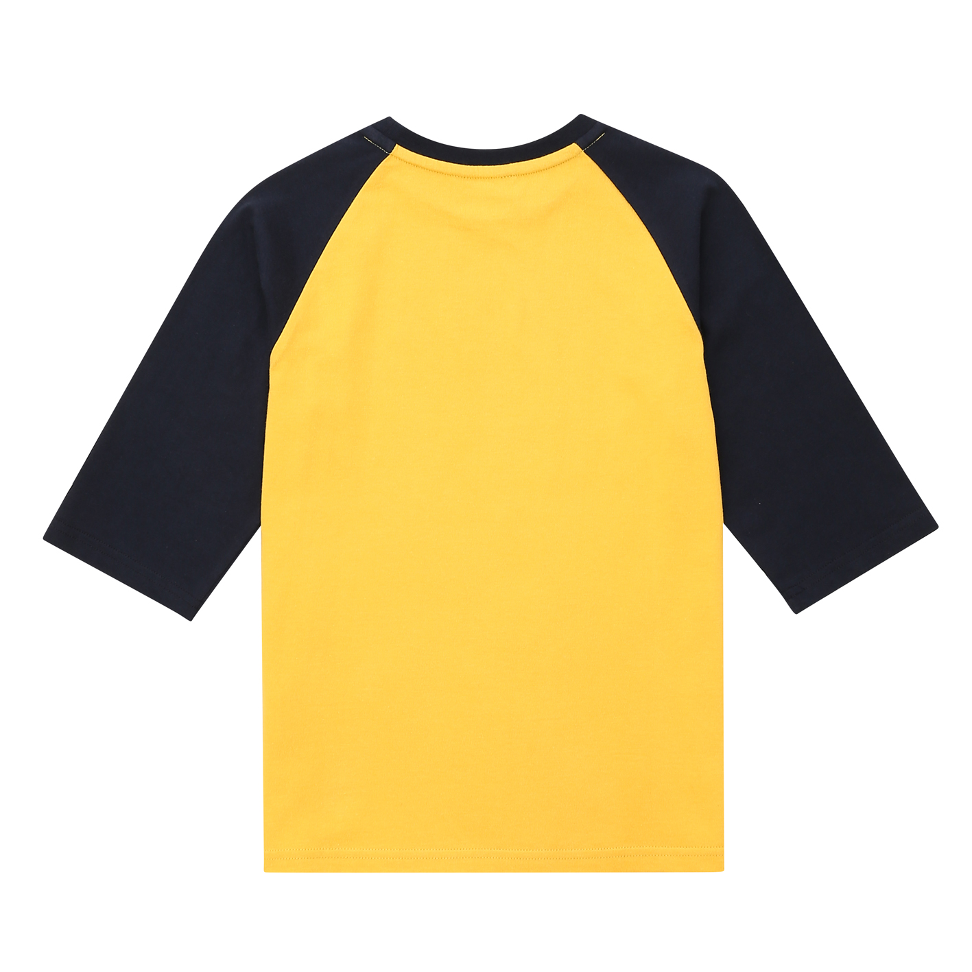 소매 7부 기장의 기본 라글란 티셔츠. 가슴 레터링으로 포인트를 준 아이템. 전략으로 판매하기 용이한 상품임.