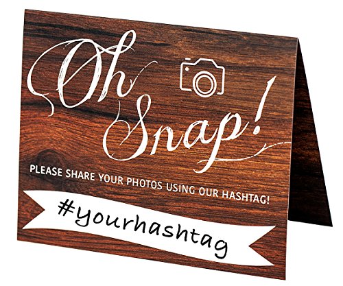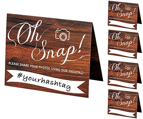 Wedding Hashtag Sign | Set of 5 Rustic Wood Look Instagram Signs | Oh Snap | 4x5 Folded Double Sided On Heavy Cardstock With Linen Texture | Beautiful Wedding Decorations