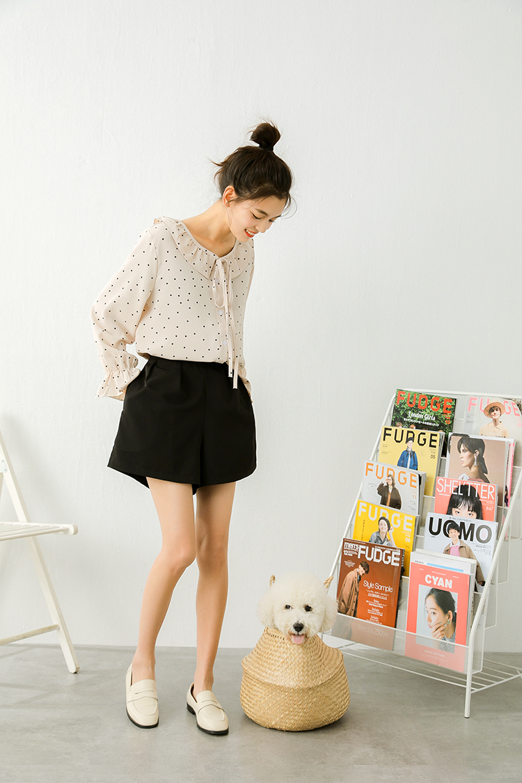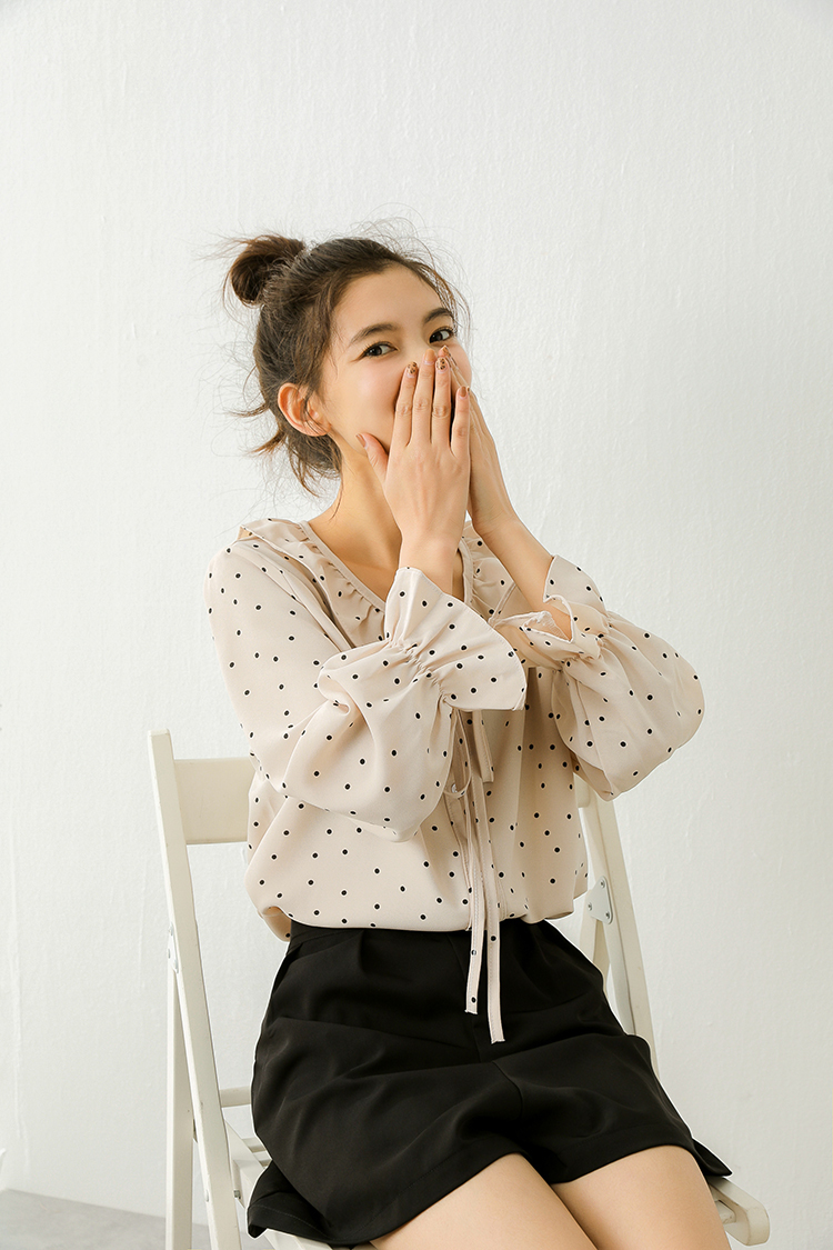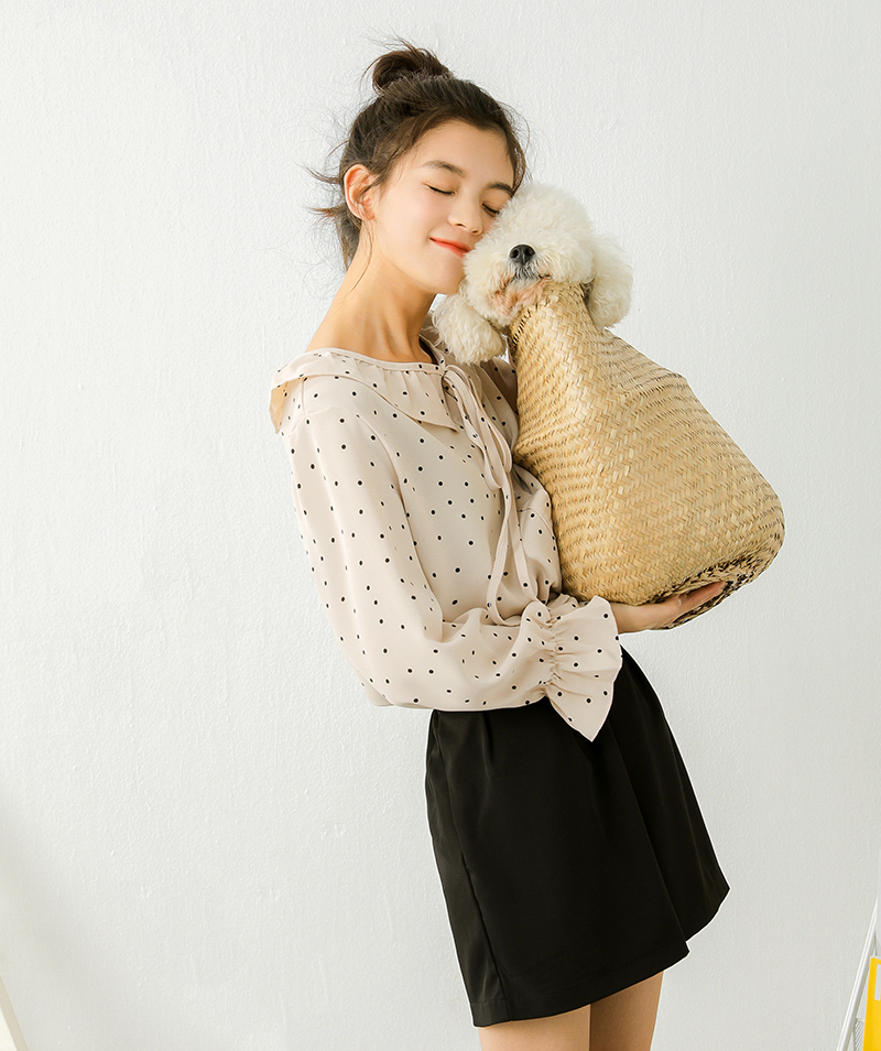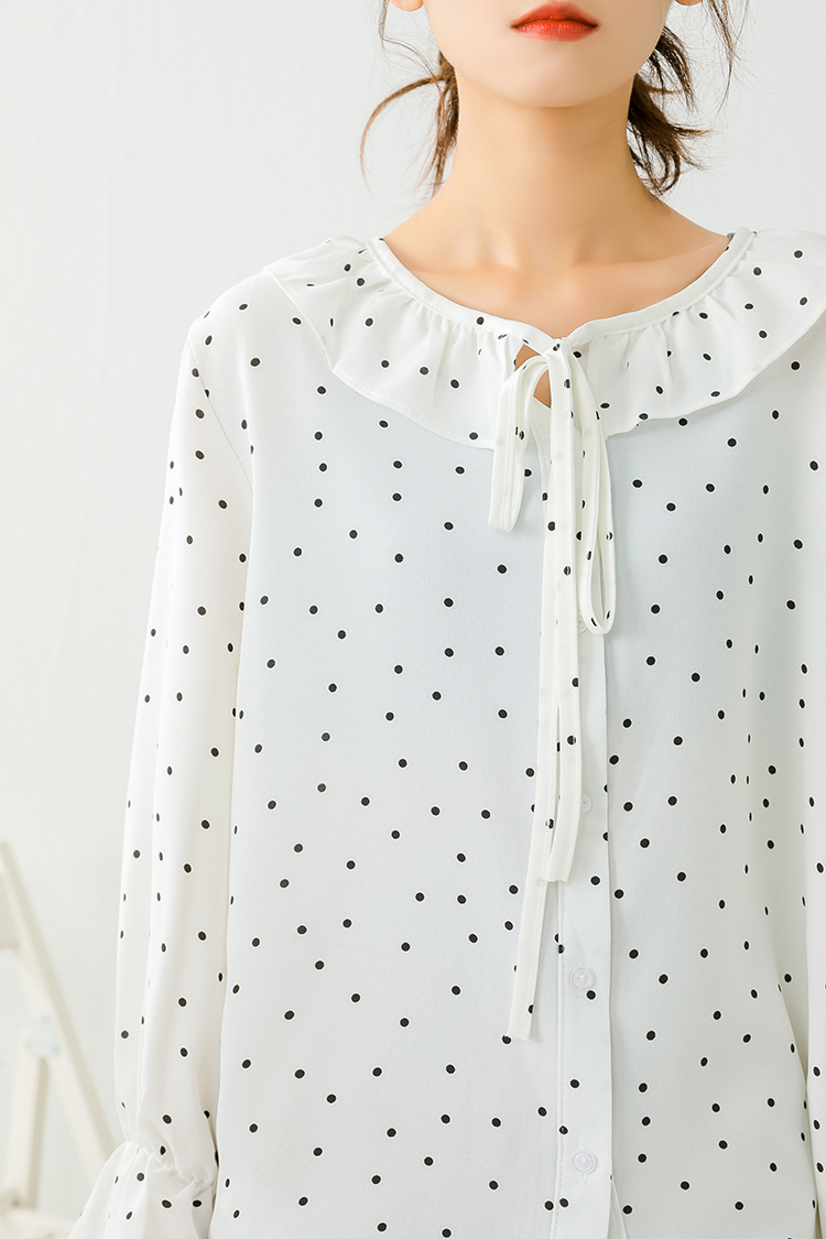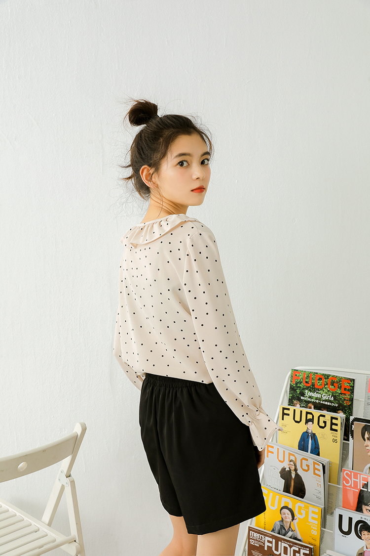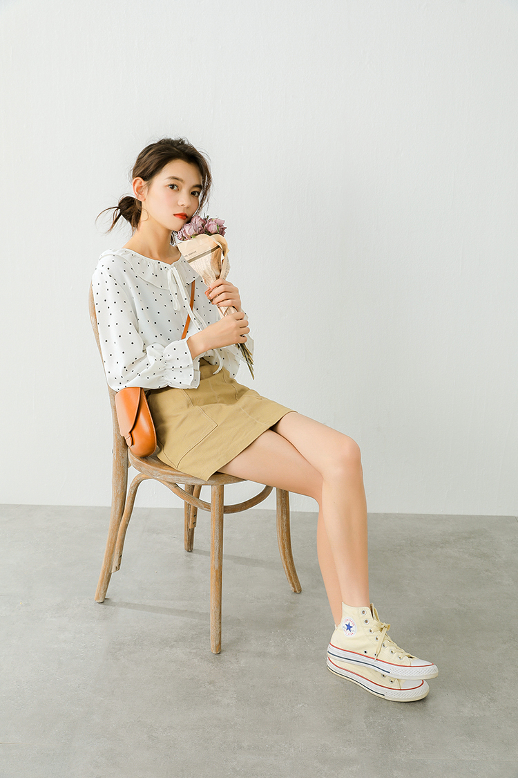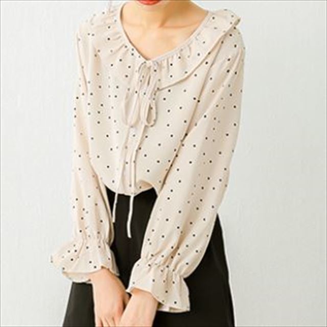 小さめのドット柄が甘くなりすぎず、ボトムス次第でフェミニンにもカジュアルにも合う1枚♪
