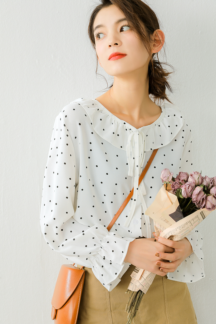 襟のフリル&シャーリングがふんわりした女の子らしいシルエットを作る長袖ブラウスのご紹介です。