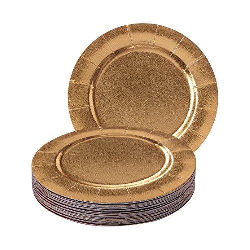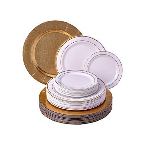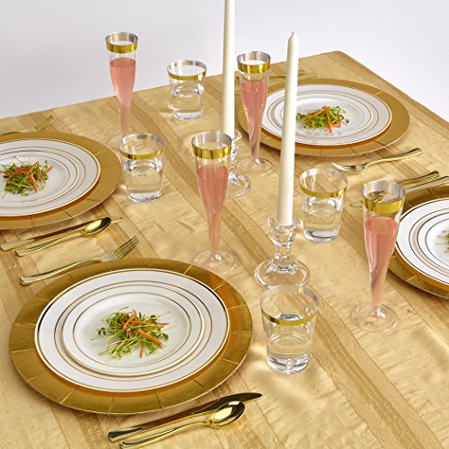 PREMIUM GRADE MATERIALS: The Golden Glare 3-Piece Place Setting features a dinnerware pattern of exquisite beauty that is both modern and elegant. Our charger plate is made from the finest cardboard materials that undergo strict quality control to meet the high standards of our valued customers. The 2 dinner plates are made from the finest quality plastic, and are resistant to sharp objects and heavy food items. They are leak-free, non-toxic and completely safe to use.