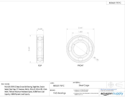 FAG 6206-2RSR-C3 Deep Groove Ball Bearing, Single Row, Double Sealed, Steel Cage, C3 Clearance, Metric, 30mm ID, 62mm OD, 16mm Width, 7500rpm Maximum Rotational Speed, 2520lbf Static Load Capacity, 4380lbf Dynamic Load Capacity