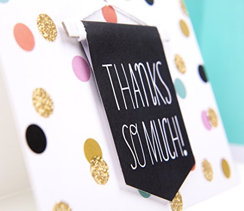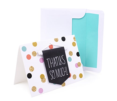 Cheerful cards feature a multicolored and gold glitter polka dot background with a banner stating, "Thanks So Much!" while the envelopes offer a colorful teal liner.