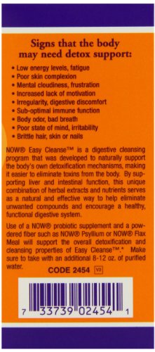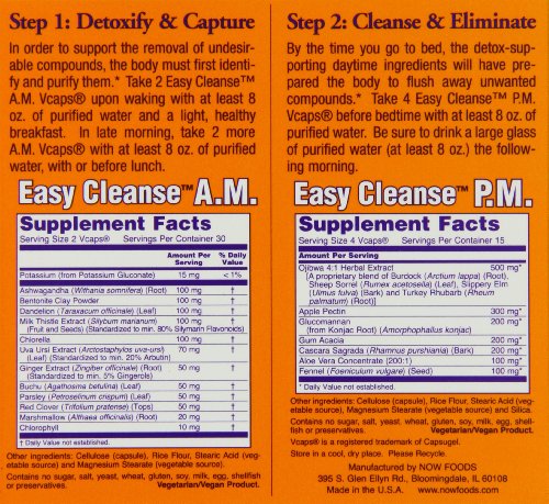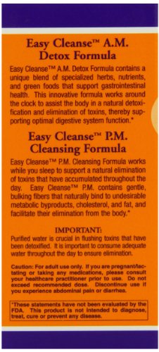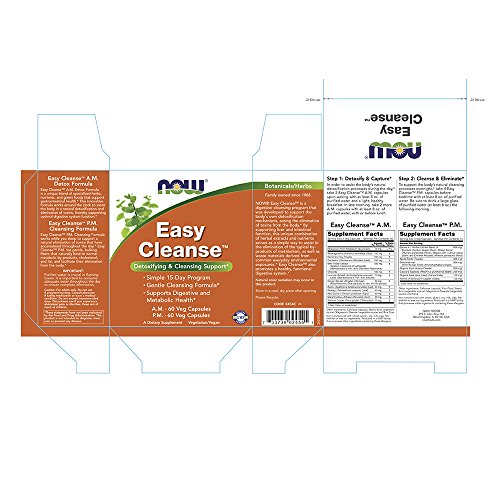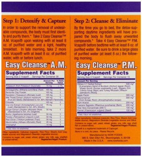 Studio : Now Foods Publisher : Now Foods Binding : Health and Beauty Product Description NOW Easy Cleanse is a digestive cleansing program that was developed to naturally support the body's own detoxification mechanisms, making it easier to eliminate toxins from the body. By supporting liver and intestinal function, this unique combination of herbal extracts and nutrients serves as a natural way to help eliminate unwanted compounds and encourage a healthy, functional digestive system. Use of a NOW probiotic supplement and a powdered fiber such as NOW Psyllium or NOW Flax Meal will support the overall detoxification and cleansing properties of Easy Cleanse.* Make sure to take with an additional 8-12 ox. of purified water. Easy Cleanseamptrade A.M. Detox Formula contains a unique blend of specialized herbs, nutrients, and green foods that support gastrointestinal health. This innovative formula works around the clock to assist the body in a natural detoxification and elimination of toxins, thereby supporting optimal digestive system functioin.* Easy Cleanse P.M. Cleansing Formula works while you sleep to support a natural eliminatioin of toxins that have accumulated throughout the day. Easy Cleanse P.M.contains gentle , bulking fibers that naturally bind to undesirable metabolic byproducts, cholesterol, and fat, and facilitate their elimination from the body.* Signs that the body may need detox support: Low energy levels, fatigue Poor skin complexion Mental cloudiness, frustration Increased lack of motivation Irregularity, digestive discomfort Sub-optimal immune function Body odor, bad breath Poor state of mind, irritability Brittle hair, skin or nails Step 1: Detoxify Capture In order to support the removal of undesirable compounds, the body must first identify and purify them.* 0