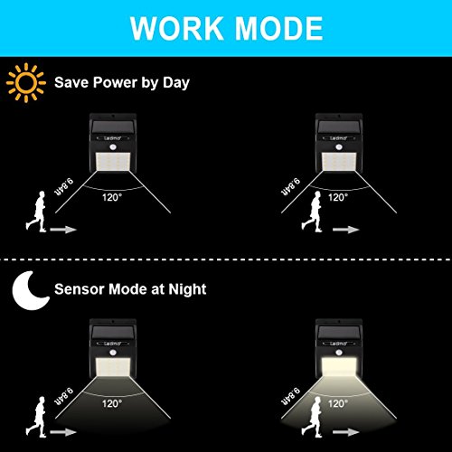 - *Motion Sensor Lights have TWO INTELLIGENT MODES AND AUTOMATIC : Dim Light Mode and Bright Light mode. Integrated with infrared sensor and light sensor. It will auto turn on Dim light when in darkness or at night, and enter into 20s Bright Light mode when motion is activated. And the solar light will auto turn off to recharge by sunlight in daytime.