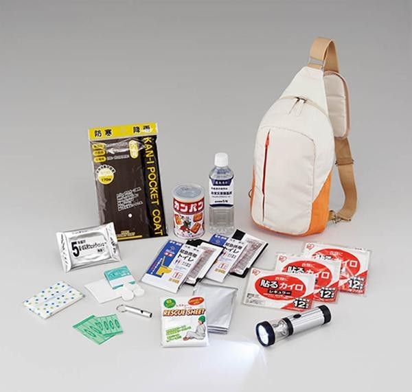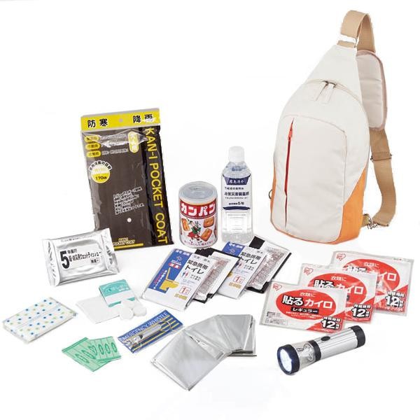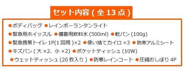 | セット内容 | ボディバッグ、レインボーランタンライト、緊急用ホイッスル、備蓄用飲料水(500ml)、乾パン(100g)、緊急携帯トイレ1P(1回用)×2、使い捨てカイロ×3、レスキューシート、キズバン(大×2、小×2)、ポケットティッシュ(10W)、ウェットティッシュ(20枚入り)、防寒レインコート、圧縮おしぼり4P |