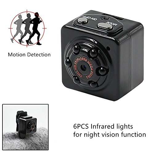 -. Feature : BASIC: HD 1920*1080P or 1080*720P video resolution,12 Million Pixels(4032*3024) snapshot pictures resolution, 6pcs IR LED lights for Night Vision when it detects lack of light, Smart Motion Detection, Built-in microphone for real-time video and audio recording, TF card slot for storage / ULTRA COMPACT:Size approx 1"*1"*0.8".Ultra light. Finger size, you can place it in a corner of your house, backyard, garden, even in your pocket or on your collar with the clip included. You can record both photos and video without anyone pay attention / FULL HD 1080P DV: With Imported HD lens, it can capture high-definition images and videos. Also works well under low illumination environment. The camera has another format 720P and you can switch two formats easily. 12 Million Pixels (4032*3024) snapshot pictures resolution / MOTION DETECTION: When object moves on the front of the obscure lens, motion detection will be activated and the device will start recording automatically. With the motion detection function, it has become possible to use for a long time / NIGHT VISION: Night vision is decent enough to make out what is going on in low light. When recording, the LED light do not bright and flash. With a 360 degree rotating stent, it can be used as a car camcorder. Built-in rechargeable Li-ion battery support using while charging
