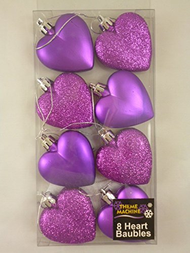 8 x 5cm Purple Glitter + Matt Heart Shaped Christmas Tree Baubles