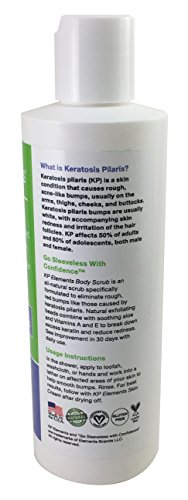-. Feature : ALL NATURAL KP BODY SCRUB for Treatment of Red Bumps on the Arms and Thighs also known as Keratosis Pilaris, or Chicken Skin / EXFOLIATES NATURALLY - Removes excess keratin and helps your skin heal without the use of harsh or irritating chemicals - Smooths your skin, naturally! / DERMATOLOGIST TESTED AND APPROVED - Have confidence in the product you are buying! / CONTAINS ALOE VERA EXTRACT, Jojoba Seed Oil, Vitamin A, and Vitamin E to cleanse skin and reduce bumps - Manage Your Keratosis Pilaris with KP Elements Body Scrub Today! / Most Effective when combined with our KP Treatment Cream - 100% Satisfaction Guaranteed!