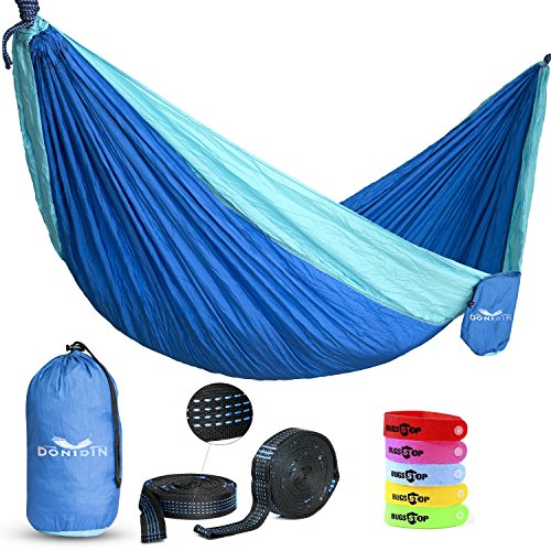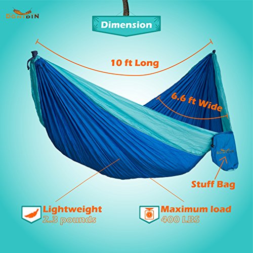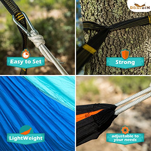 Double Hammock, XL, Fits 2 (up to 400 lbs.) For Outdoors, Camping, Hiking, Beach, Yard, Top Quality Parachute Nylon, Weather Resistant, 118" L x 78" W - 2 Bonuses. (Blue Or Bright Orange) By Donidin.