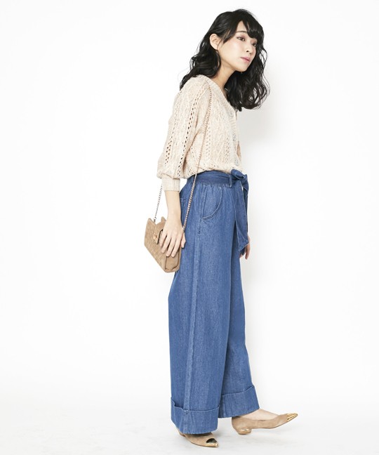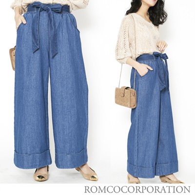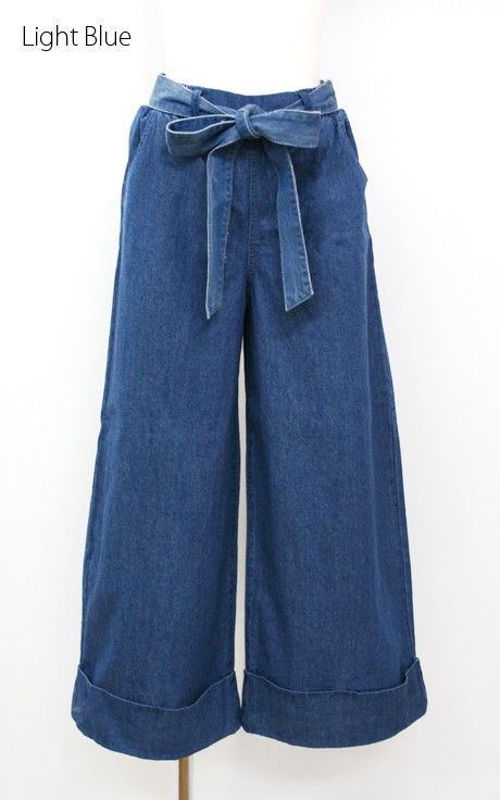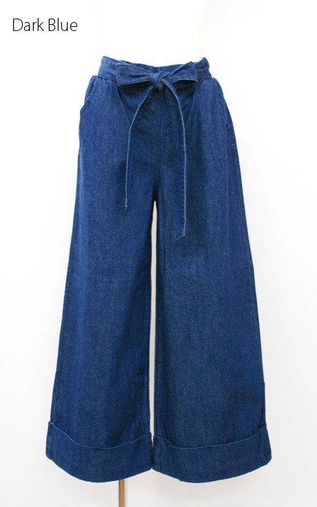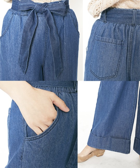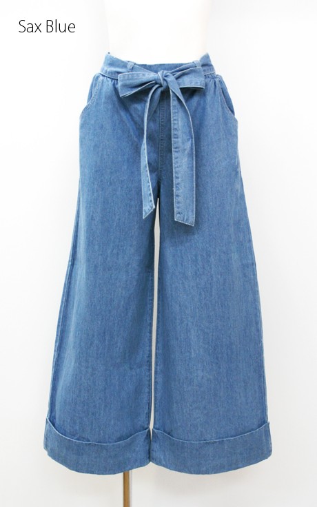 もともと裾がロールアップされています♪共布のリボンがベルトになるのでポイントとしてとってもオシャレ★すらっとした足長効果ありのワイドパンツです!ウエストはゴムなので履きやすい!◆モデル 身長163cmMサイズ