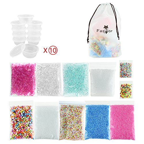 Package Includes - 21 Pack(10 PACK clear storage containers for 20g slime, 3 PACK assorted color fishbowl beads 1.76oz each(clear, light blue, rose red), 1 PACK clear slushie beads 3.5oz, 5 PACK assorted color foam beads 0.08 to 0.32 inches (white, blue, pink, mixed color small ball 3000pcs each , mixed color big ball 1000pcs), + bonus 1 PACK fruit splice 500pcs, 1 PACK glitter sequins 3g).