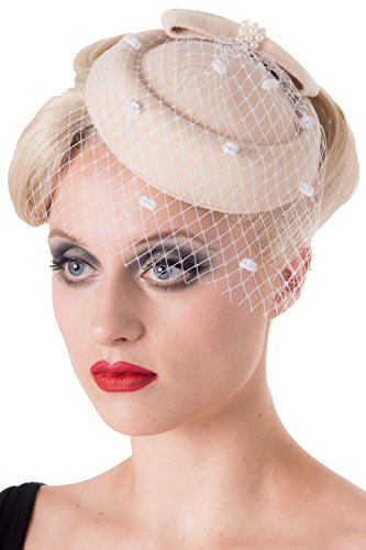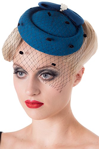 Product Description Vintage retro style by banned Apparel. Available in seven colours the Judy pillbox hat is the perfect accessory for your vintage retro outfit. The Judy has bow and pearl detailing and is finished with black net. The Judy is fixed in place by a hidden steel clasp. 0
