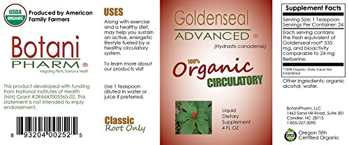 Studio : BotaniPharm Publisher : BotaniPharm Binding : Health and Beauty Product Description Hydrastis canadensis, or goldenseal, is one of those bitter herbs whose beneficial effects on digestion were first shown to European Settlers by the Native Americans. Traditionally used for infections, digestive disorders, sore mouth, and wound healing, more than 3,000 scientific articles currently exist supporting the potential benefits of goldenseal and/or it primary alkaloid constituent, berberine. Modern science has discovered these effects can be attributed to a number of compounds found in the plant called alkaloids, the primary one being berberine. Besides the active compounds in goldenseal, the plant contains other constituents which act synergistically with the alkaloids to increase their potency and/or reduce any potential adverse effects. Another beneficial aspect of goldenseal is that it does not contribute to the emergence of drug resistant bacteria. One of the most often reported historical uses for goldenseal is for cases of bacterial induced diarrhea. Made in the USA. Certified organic Contains 4 fl. oz. *These statements have not been evaluated by the Food and Drug Administration. This product is not intended to diagnose, treat, cure or prevent any disease. Individual results may vary. 0