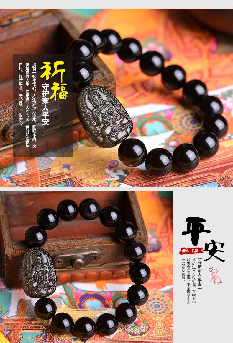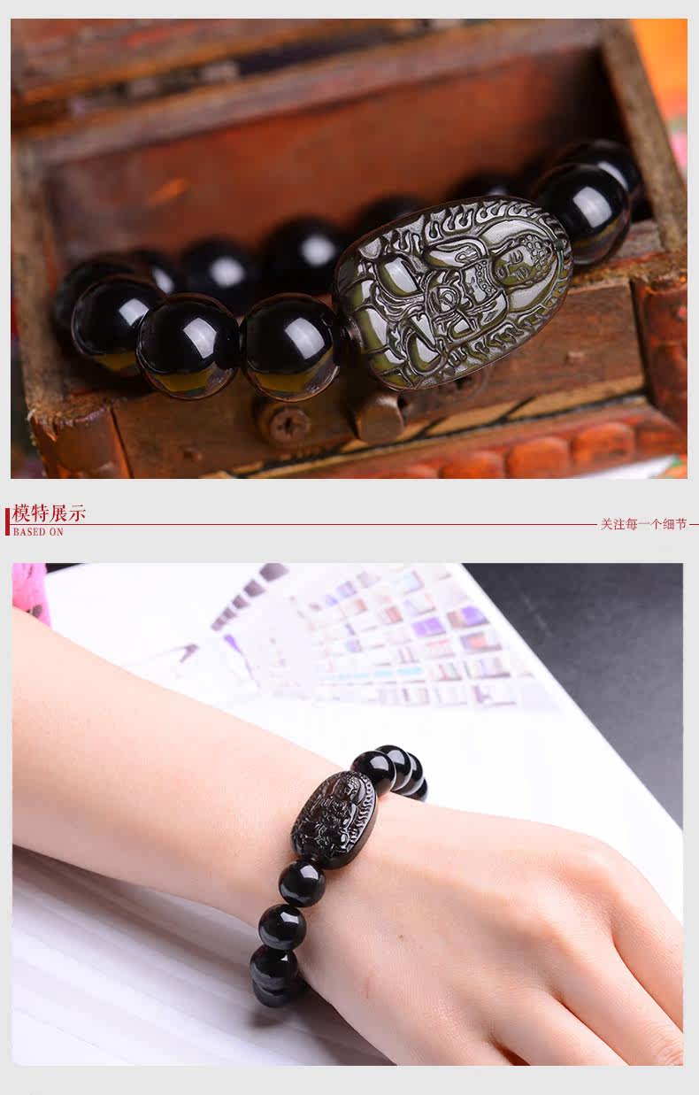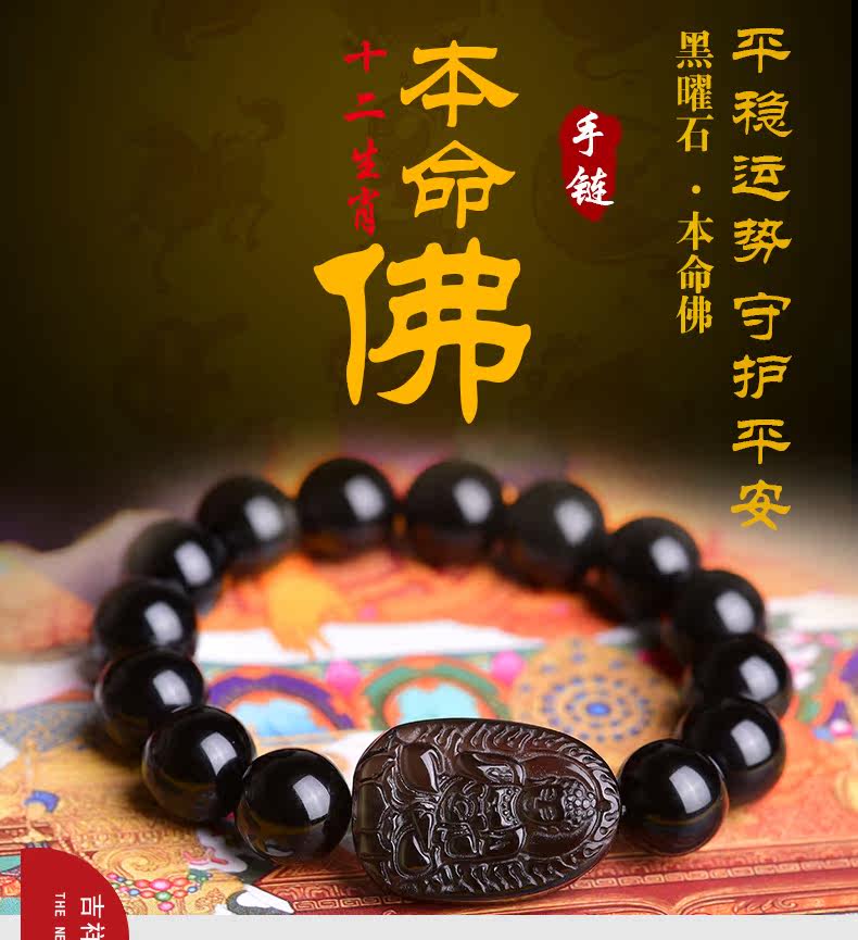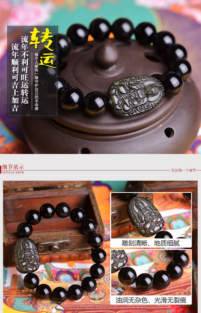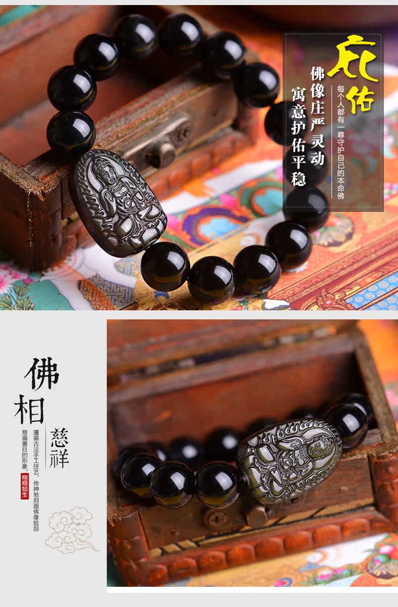开光天然黑曜石阿弥陀佛手链十二生肖属狗猪本命佛守护神佛珠手串