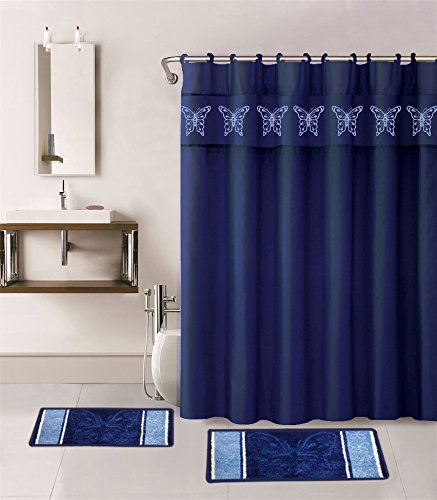 15 Pieces Navy Solid Color with Embroidery Butterfly Design Bathroom Mats Set Non-slip Rug Carpet Shower Curtain and Hooks