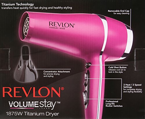 -. Binding : Health and Beauty -. Brand : Revlon -. EAN : 0761318051909 -. Feature : Superior results in less the time / Titanium technology transfers heat quickly for faster styling and less over drying / 3 heat/2 speeds settings for complete drying and styling flexibility / Cold shot button releases cool air to set the style / Removable end cap for easy cleaning and increased dryer longevity -. IsAdultProduct : 0 -. Label : Helen of Troy -. Manufacturer : Helen of Troy -. MPN : RVDR5190N1 -. NumberOfItems : 1 -. PackageQuantity : 1 -. PartNumber : RVDR5190N1 -. ProductGroup : Beauty -. ProductTypeName : BEAUTY -. PublicationDate : 2015-04-17 -. Publisher : Helen of Troy -. ReleaseDate : 2015-05-28 -. Studio : Helen of Troy -. Title : Revlon RVDR5190 VolumeStay 1875 Watt Titanium Hair Dryer -. UPC : 761318051909