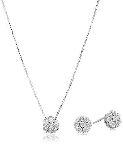 -. Binding : Jewelry -. Brand : Amazon Collection -. Color : White -. Department : womens -. Feature : Jewelry set featuring sterling silver pendant necklace and stud earrings with clusters of round diamonds in faceted frames / Necklace features box chain and sP.R.Ing-ring clasp / Earrings feature friction-back posts / Imported / Carat weight listed is the total for all stones. / All our diamond suppliers confirm that they comply with the Kimberley Process to ensure that their diamonds are conflict free -. Label : Amazon Collection -. Manufacturer : Amazon Collection -. Model : E21032DISSSET -. MPN : E21032DISSSET -. PackageQuantity : 1 -. PartNumber : E21032DISSSET -. ProductGroup : Jewelry -. ProductTypeName : FINEOTHER -. Publisher : Amazon Collection -. Studio : Amazon Collection -. Title : Sterling Silver Diamond Accent Miracle Plate Cluster Earrings and Pendant Necklace Jewelry Set (1/10 cttw, I-J Color, I2-I3 Clarity), 18"