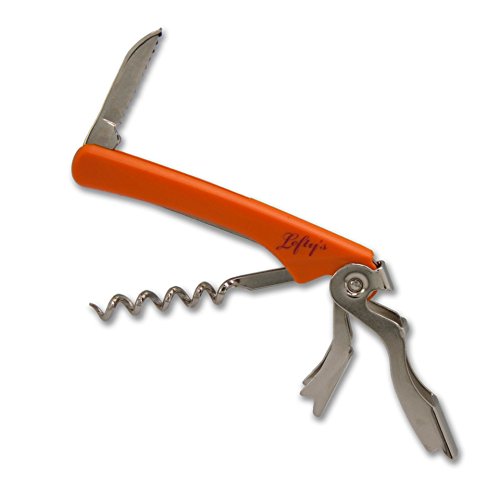 Product Description Lefty's Logo Corkscrew: this versatile corkscrew comes with four different tools, a knife, corkscrew, bottle gripper and bottle opener, all of which fold into a handy and compact orange body. 0