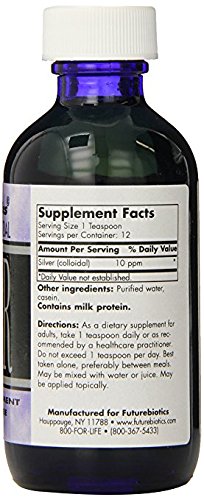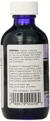Studio : Futurebiotics Publisher : Futurebiotics Binding : Health and Beauty Product Description Futurebiotics advanced colloidal silver is a high quality silver product easily absorbed by the body. This potent liquid solution may be taken orally or applied to the skin. Contains no: yeast, sugar, starch, salt, wheat, corn, soy, dairy products, animal products, artificial preservatives or colorings. Details weight 1.00 lbs size 2 oz. 0