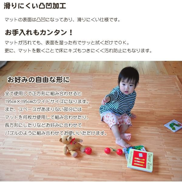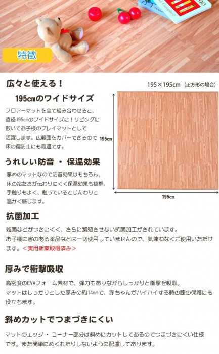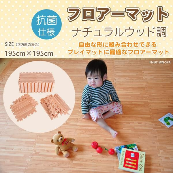 fk094igrjsインテリアにもしっくり馴染むシンプルな色使いのフロアーマットです。場所に合わせて自由に組み合せが可能。しっかりとした厚みで衝撃を吸収しやすく、床の傷防止や防音にも役立ちます。また、ハイハイ時のお子様のひざの保護などに役立ちます。 製造国:台湾 素材・材質:EVA樹脂 商品サイズ:正方形マット:約W32×D32×H1.4cm、エッジマット:約W9×D32×H1.4cm、コーナーマット約W9×D32×H1.4cm セット内容:正方形マット×36枚、エッジマット×16枚、コーナーマット×8枚 ※サプライヤー直送品 ご注文後2~3営業日後の出荷となります【商品名】リトルプリンセス 抗菌加工 フロアーマット ナチュラルウッド調 195cm×195cm PN501WN-SPA