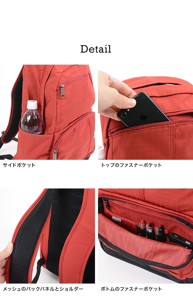 | 仕様 | W:27cm×H:45cm×D:13cm 正面ポケット×2、サイドポケット×2、内側ポケット×2、その他ポケット×4 重量:605g | ||