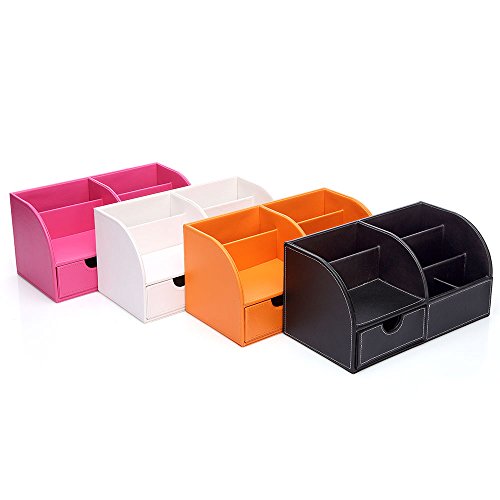 Attractive ,stylish design and large capacity ; 6 divided compartments to organize all your office supplies, pen/pencil, scissors, remote control , cell phone and cards or other small supplies; Small-notched supply drawer pulls out to hold 4- by 4.5-inch notepads.