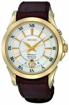 Collection: Premier Case Size: 40mm Technology: Perpetual Calendar Once set, the calendar automatically adjusts for odd and even months including February of leap years Indicates month, date and year Stainless Steel Gold-Tone Case Brown Leather Strap Gold tone hands and hour markers Roman Numeral Display White Dial Caliber: 6A33 Water Resistance: 100M Style #: SNQ118