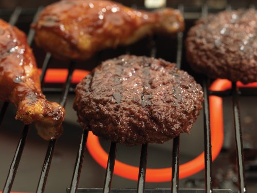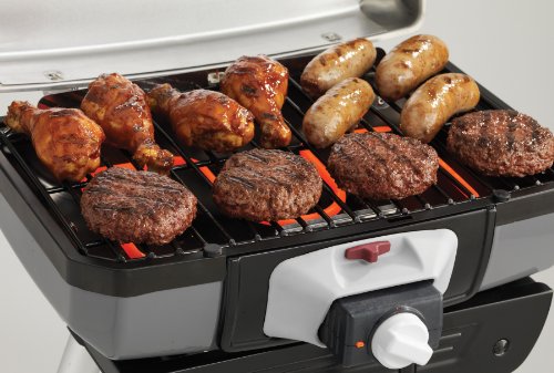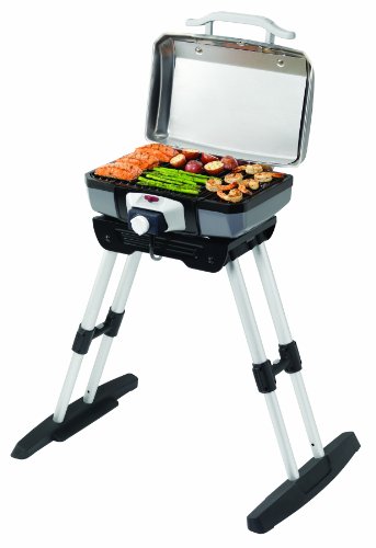 - Feature : Portable electric grill with 145-square-inch grilling area and telescoping stand / Cooks 8 burgers, 8 steaks, 6 to 10 chicken breasts, or 4 pounds of fish at once / Powerful 1,500-watt, 5,120 BTU burner and porcelain-enameled grill grate / Plugs into standard electric outlet; stand sets up and packs away in seconds / Pronounced briefcase-style carrying handle; weighs 17 pounds / 145 square inches grilling surface / 1500 watts, 120v / 60hz / Convenient telescoping base for easy storage and comfortable grilling height