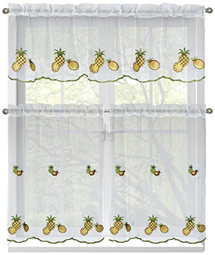 Window Elements Embroidered 3-Piece Kitchen Tier and Valance 60 x 54 Set, Pineapple