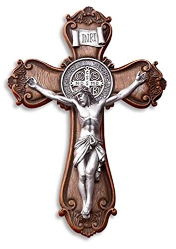 Beautiful resin St. Benedict crucifix features the St. Benedict Medal centered behind Jesus. Hang this highly detailed wood look crucifix in your home, office or anywhere you would like to call down God's blessing and protection.