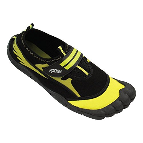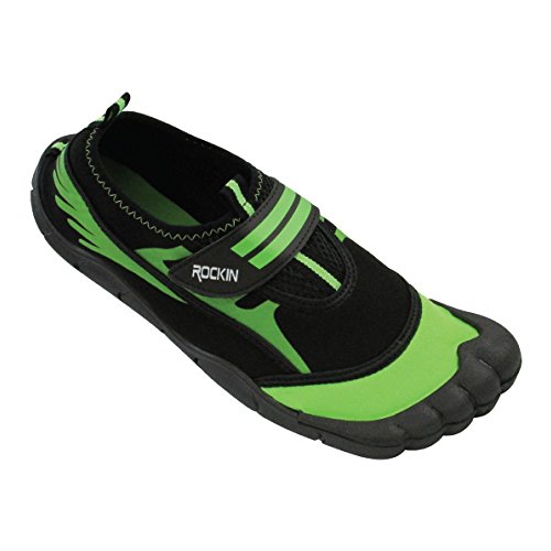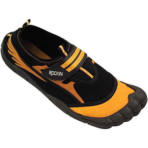-. Binding : Apparel -. Brand : Rockin Footwear -. Department : mens -. Feature : The amphibious design will protect your toes & feet from sand to surf. / Breathable mesh panels & Velcro strap. / Extra durable traction sole will keep you sturdy and reduce slips. / Easy on & off hook and loop closure. / Made of durable rubber for longer lasting. -. Label : Rockin Footwear -. Manufacturer : Rockin Footwear -. NumberOfItems : 1 -. PackageQuantity : 1 -. ProductGroup : Shoes -. ProductTypeName : SHOES -. Publisher : Rockin Footwear -. Studio : Rockin Footwear -. Title : Rockin Footwear Mens Aqua Foot Water Shoes