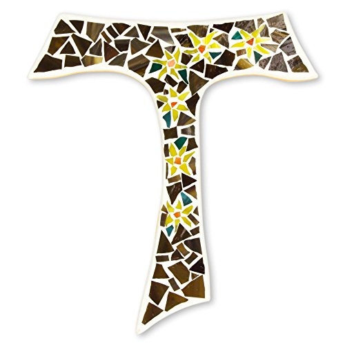 NOVICA Floral Glass and Wood Wall Cross, Brown and Yellow, 'Tau Easter Lilies'